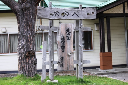布部駅を降りて、木造の駅舎を出て右手に、倉本聰氏直筆の「北の国此処に始まる」の立看板があります